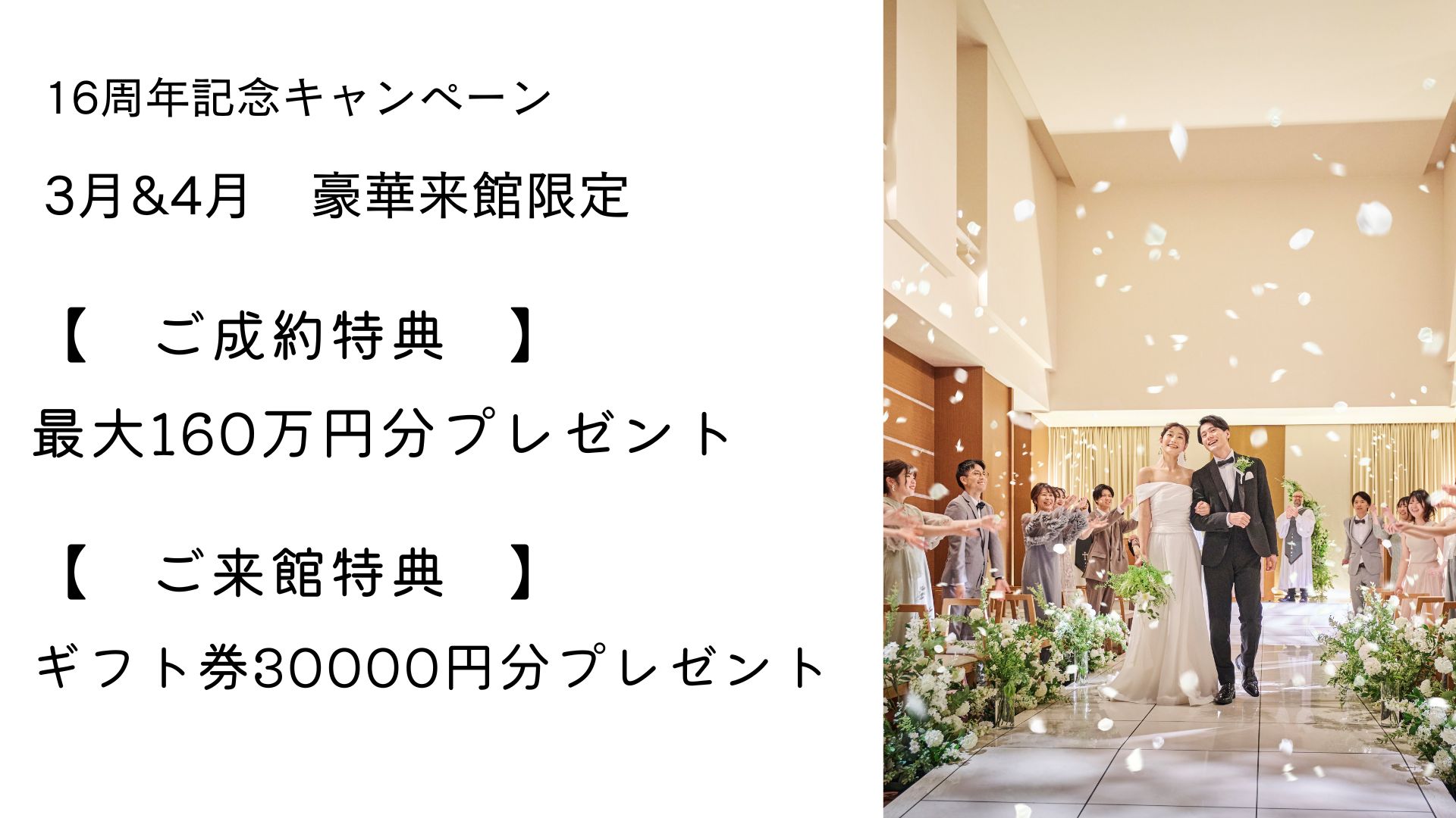 16周年を記念してのプランは最大160万円OFFの豪華プラン!なんと対象期間&対象人数の方全組適応!!この機会に是非ご結婚式を♪